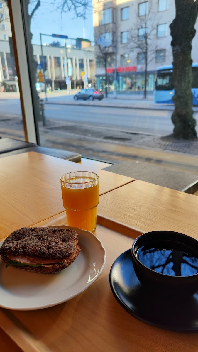 Herkullinen aamupala klo 8 kun paikka avattiin Sinuhen ruisleipä, tee sekä lasillinen mehua 7,50e. Leipä olikin kuin juuri leipomosta saapunut, tuore ja maukas. Suosittelen maistelemaan myös tuoreita leivonnaisia.