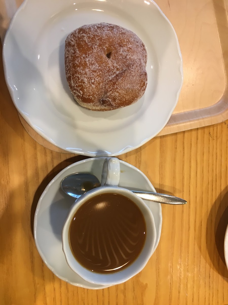 Perus kahvi, hyvä mustikka pulla! Tilava paikka ja isot lasi ikkunat ovat iso plus.